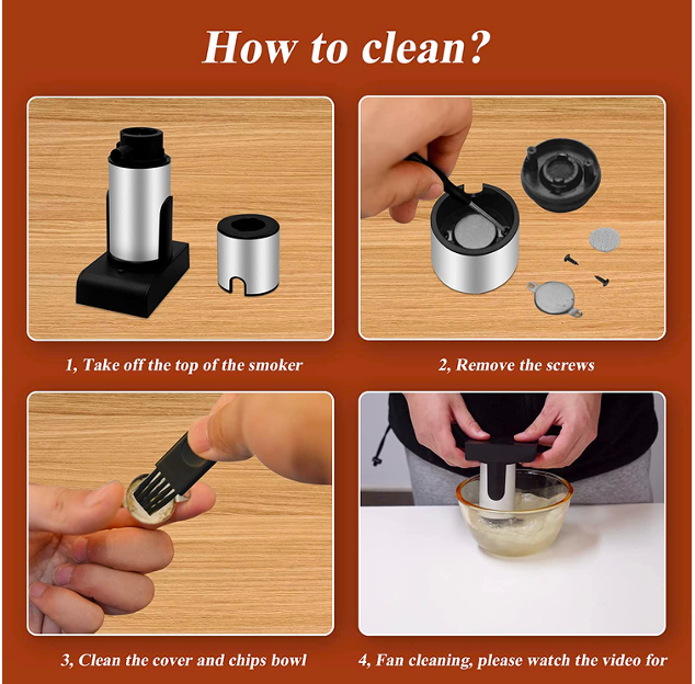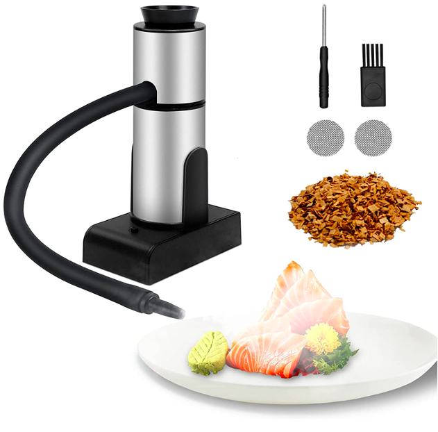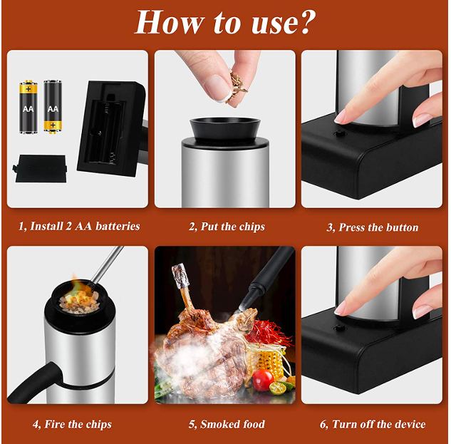 Package Included:1 * smoke gun, 1 * extra filter, 1 * small screwdriver, 1 * small brush, 4 * wood chips (hickory, cherry, apple, oak), 1 * user manual