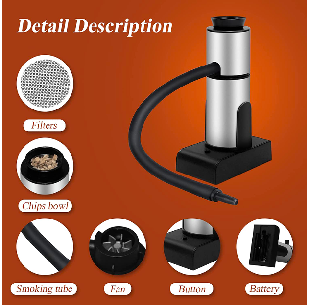 This portable cocktail smoking gun is a very light and elegant accessory to enhance your cocktail experience. Easy to assemble, disassemble, and portable. Nice smoking tool gadget for yourself or smoky flavour lovers, Designed with a lightweight, yet heavy-duty metal body. This enables you to add smoky flavour and aroma to your food or drinks in a short time, a nice smoking tool gadget for yourself or smoky flavour lovers. This portable smoker for food and drinks is powered by 2xAA batteries( NOT included). Suitable for your home kitchen, bar or outdoor use like BBQ, picnic, hiking, etc.