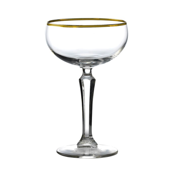 Speakeasy Gold Banded Coupe: Perfect for the current desire for glassware with retro themes. Speakeasy cocktail glasses that totally fits a vintage theme especially with this elegant gold band around its rim.